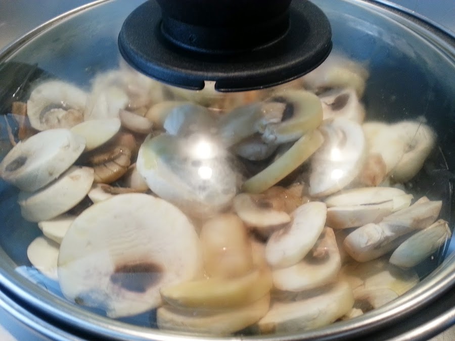 3. - En ese momento añadimos los champiñones, removemos y tapamos, y dejamos cocinar unos 15 minutos, removiendo de vez en cuando.