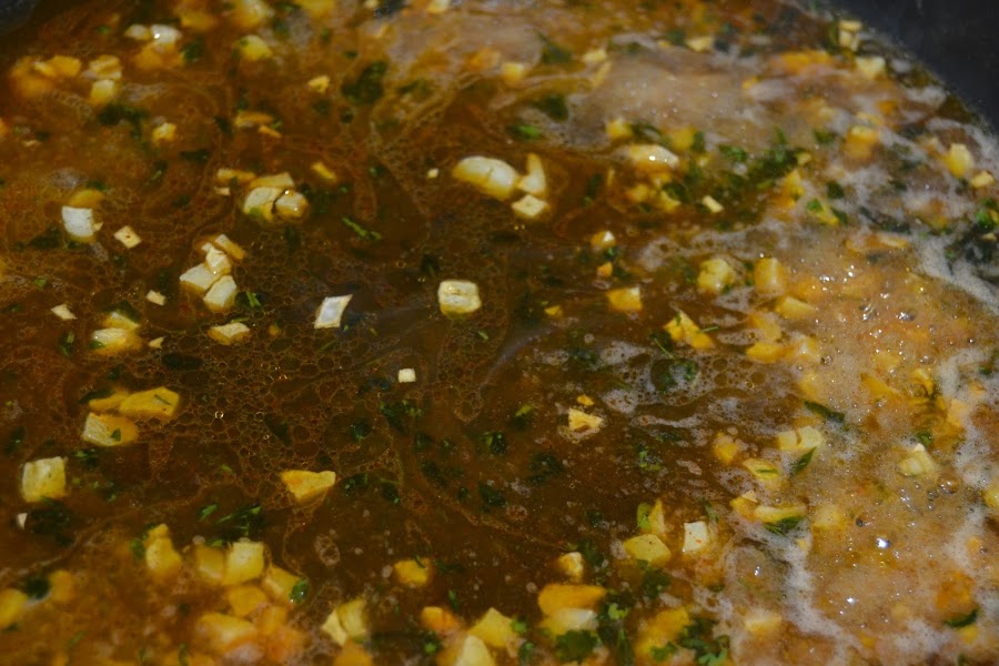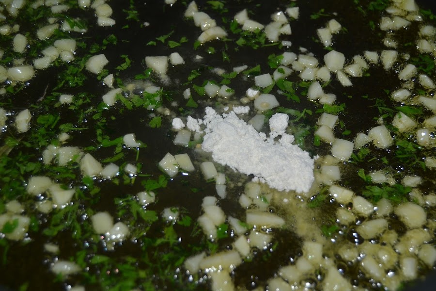 Ponemos en un perol el aceite y añadimos los ajos cortados pequeñitos con el perejil.