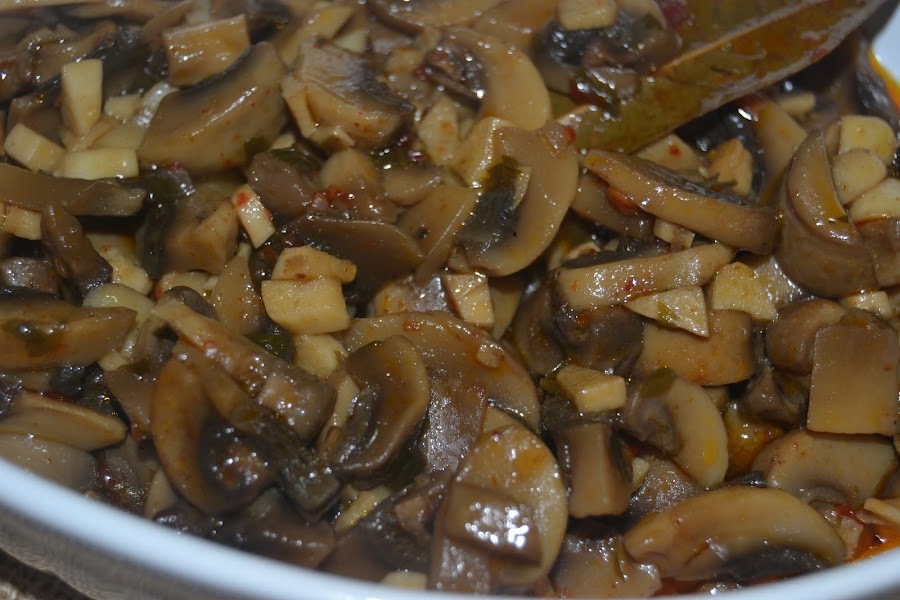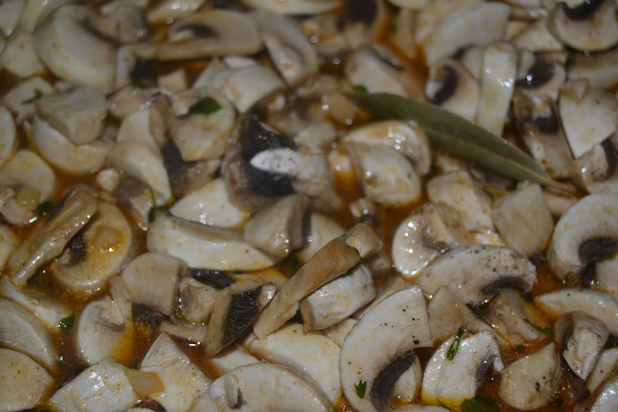 Añadimos los champiñones, la pimienta molida, la hoja de laurel y la sal, removemos de vez en cuando hasta que se pongan tiernos y apartamos.