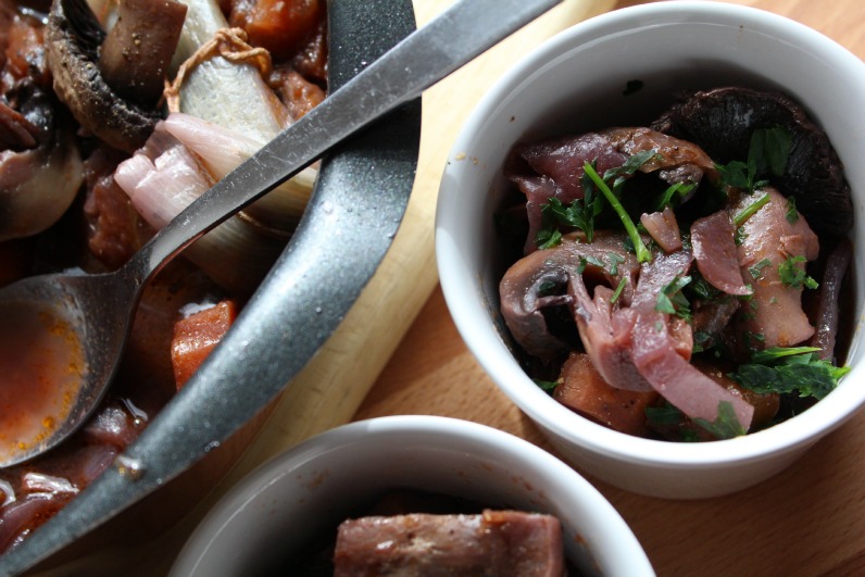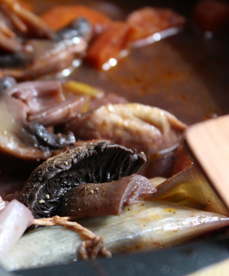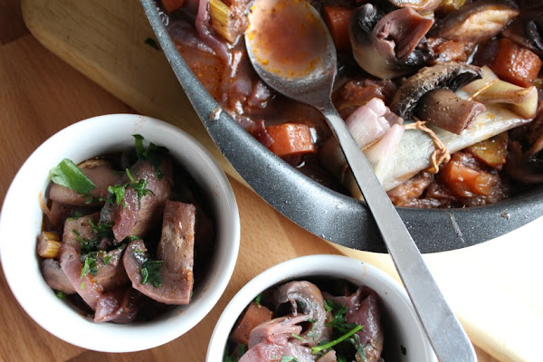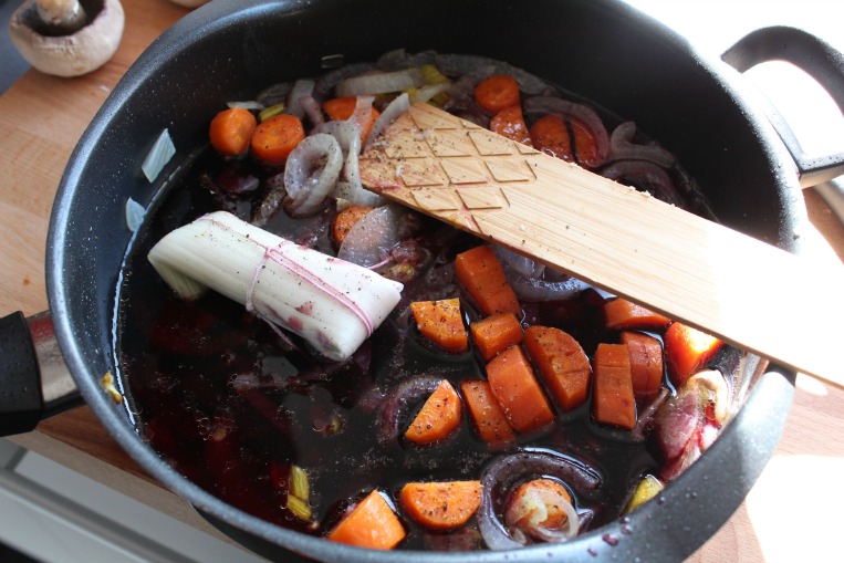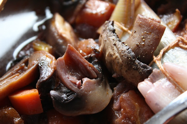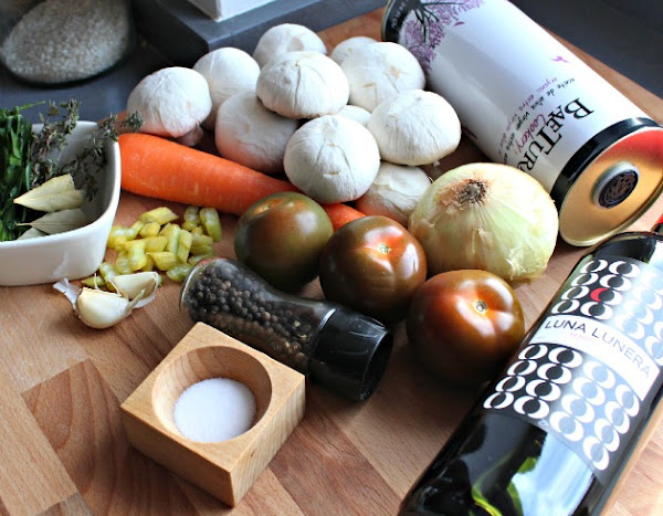 Vino tinto. Cuanto más riKo, mejor. El bouquet garni, sal, pimienta, los tomates y los champiñones.