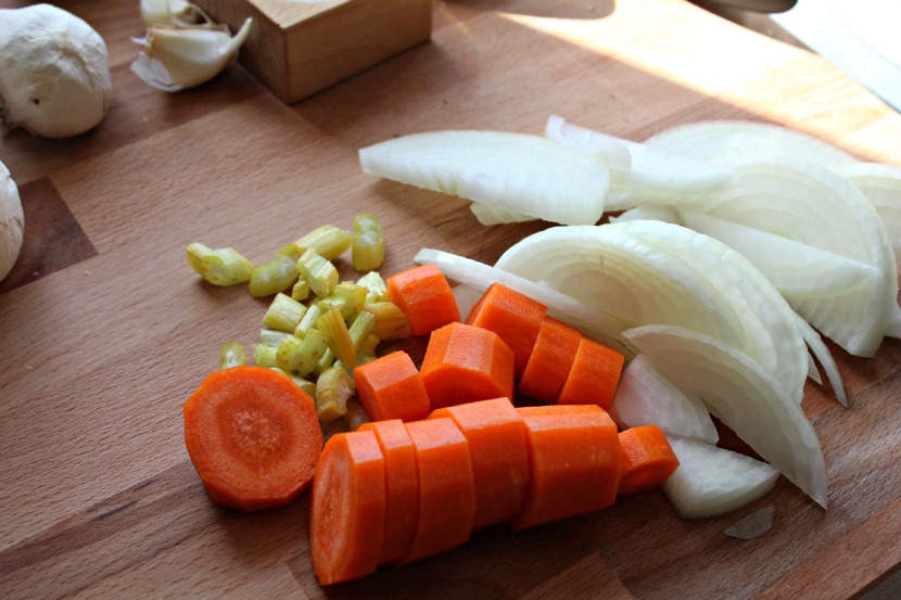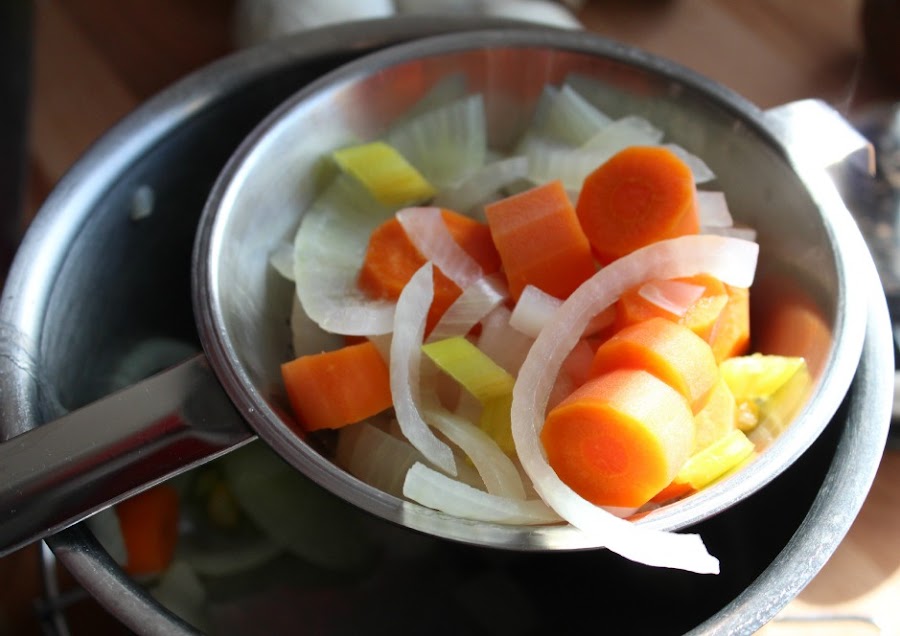 Pelamos la cebolla y la zanahoria, troceamos junto con el apio y en una cazuela de agua hirviendo, los cocemos, 5 minutos.