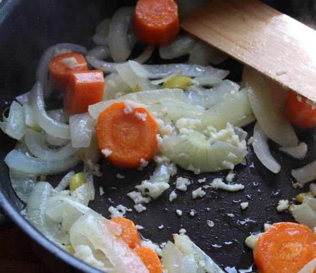 En una sartén, ponemos el aceite y rehogamos, la cebolla, la zanahoria y el apio, durante unos 3 minutos, removiendo a menudo.