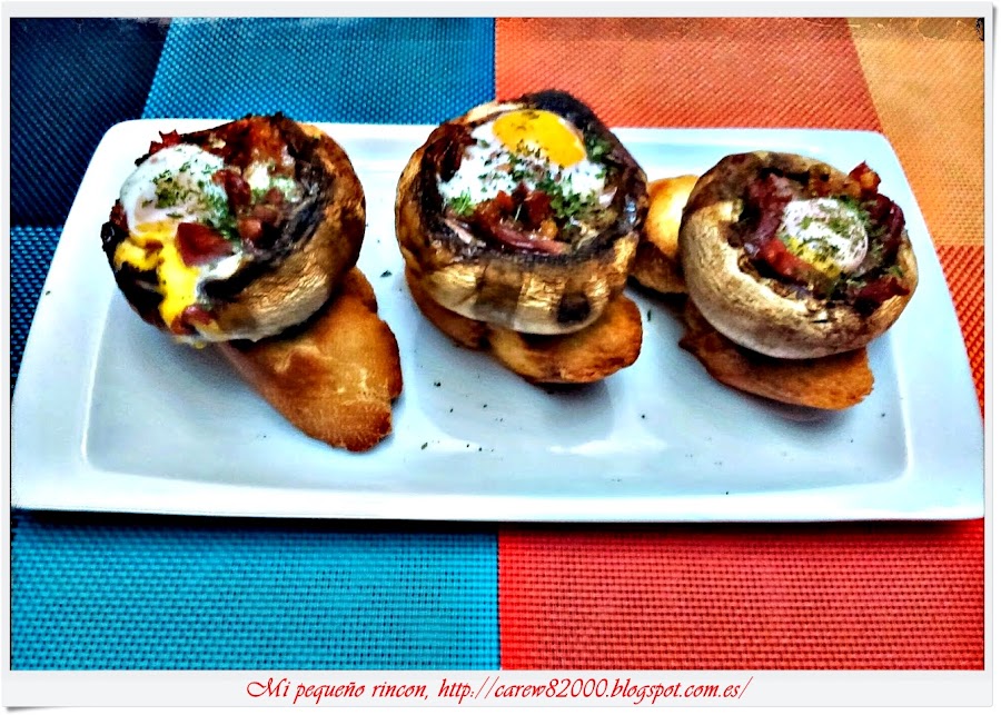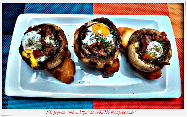 Terminado sacamos y emplatamos colocando cada champi en una rebanada de pan, si queréis darle un toque más de sabor ponerle al pan tomate rallado queda de maravilla.