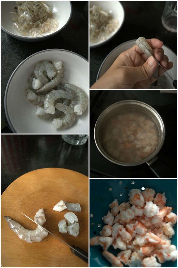 Peel shrimps, removing head and gut, and cut into 4-5 pieces each.