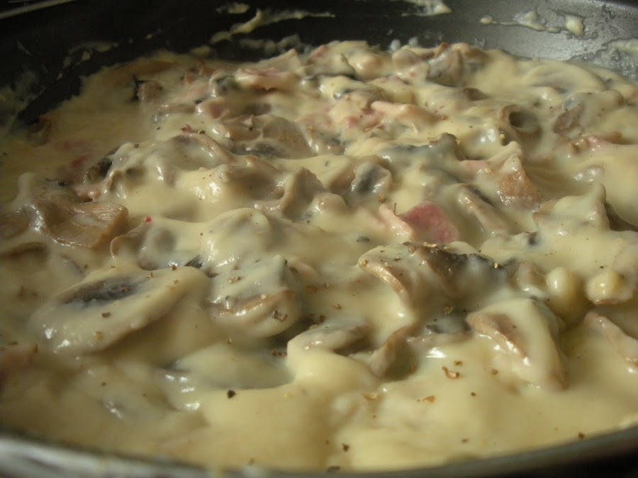 A continuación le agregamos la nata (crema de leche) líquida, los champiñones y las tiras de jamón cocido. Calentamos y servimos.