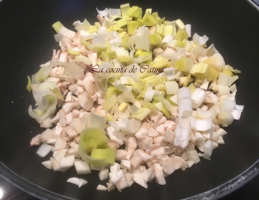Ponemos una sartén al fuego con aceite y salteamos los tallos de los champiñones, el puerro y los ajos previamente picados.