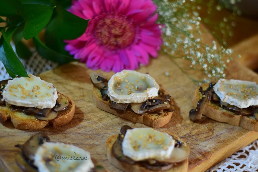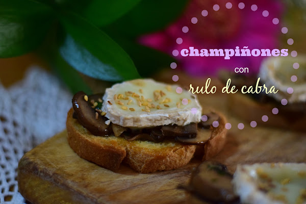 Ponemos los champiñones encima del pan tostado, colocamos una rodaja de rulo de cabra y espolvoreamos con sésamo.