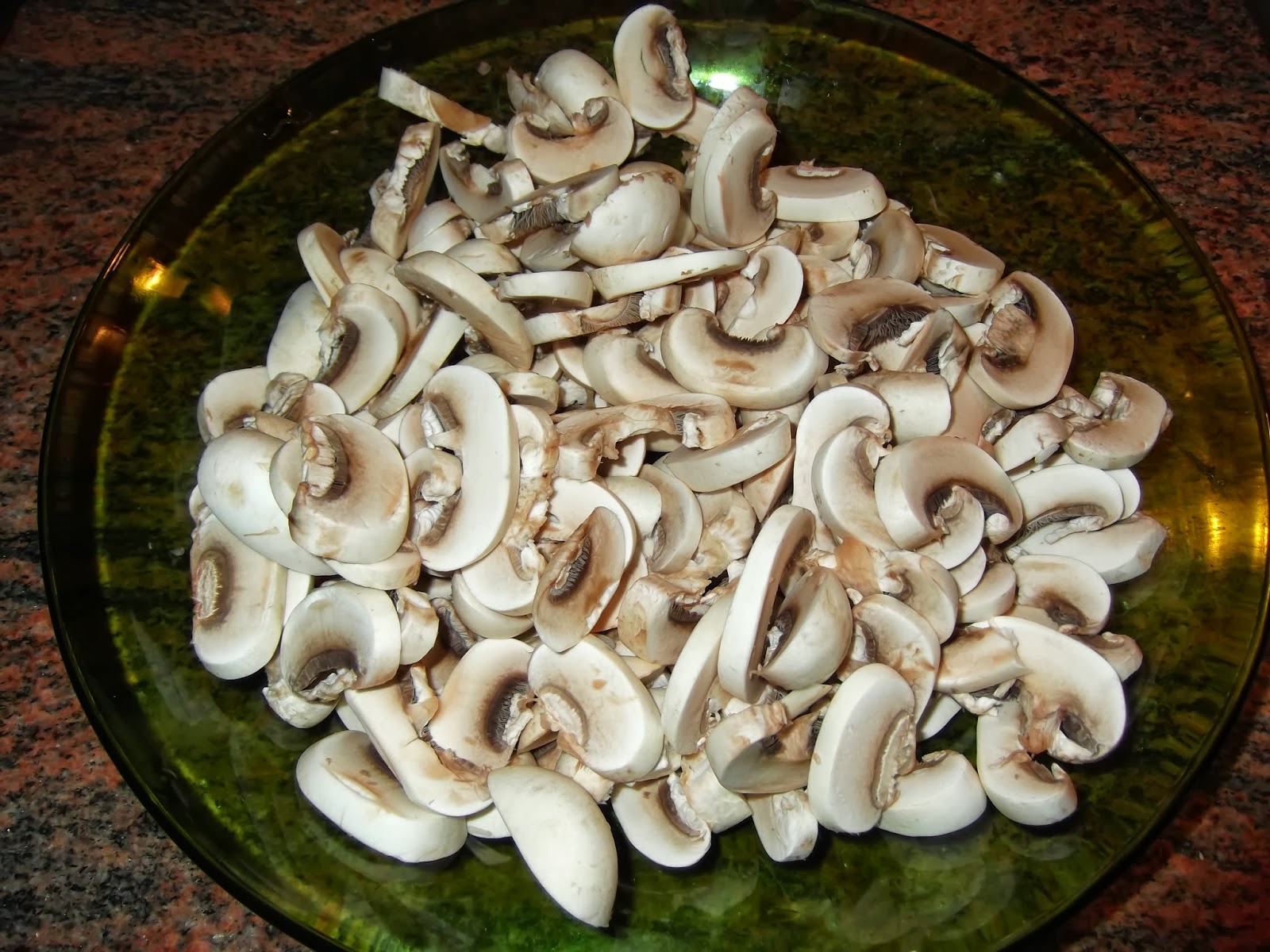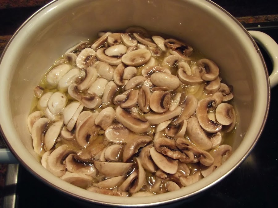 Mientras se cocina la cebolla, vamos a limpiar los champiñones, les quitamos el rabo y los cortamos en láminas no muy gordas, ya que se tienen que hacer con la cocción y si no se os pueden quedar un poco crudos. Salamos los champiñones.