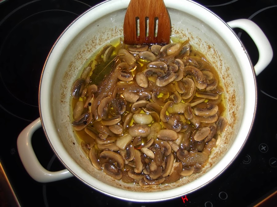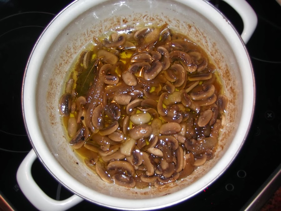 A continuación, echamos el aceite (hay que restar lo que ya le hemos puesto al principio), la pimienta, la hoja de laurel, los tres dientes de ajo pelados (pero no cortados) y los champiñones, los dejamos en la cazuela a fuego medio-fuerte durante media hora y ya están listos para degustar, daros cuenta que no se os tienen que quedar muy secos, sobre todo si os los vais a comer al siguiente día, ya que tendréis que calentarlos de nuevo. No obstante, los podéis probar y si queréis los podéis tener algunos minutos más. Ya veréis que plato más original y sabroso.