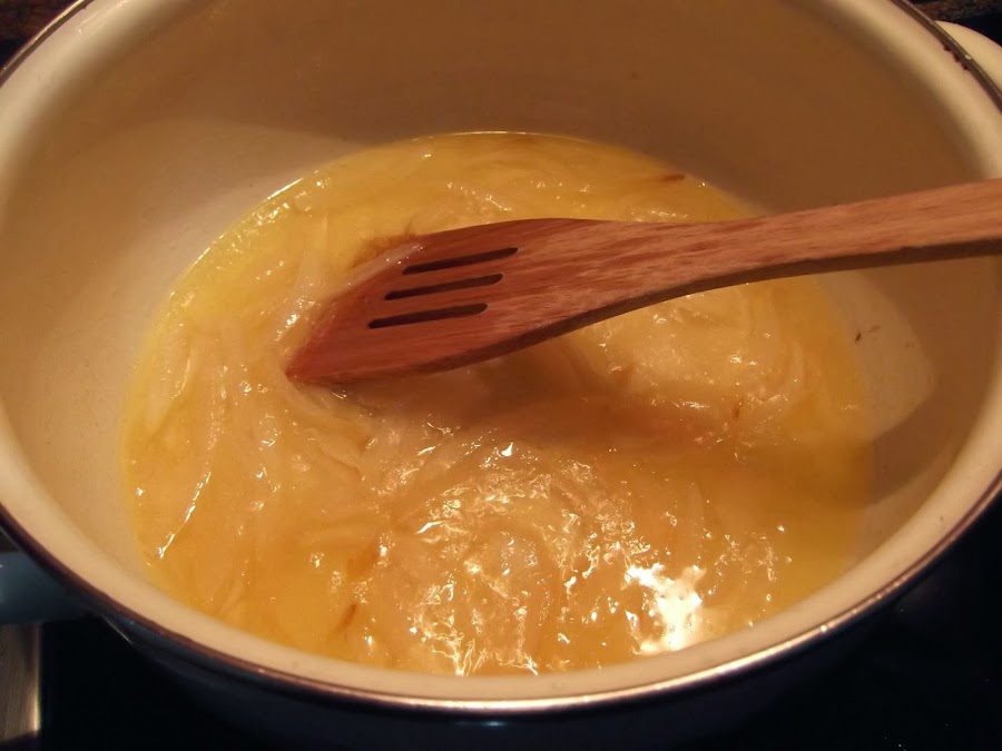 Cuando la cebolla está transparente le añadimos el vinagre y la dejamos unos diez minutos hasta que se haya evaporado la mitad del vinagre, esto le da un toque muy rico a la cebolla. El siguiente paso es añadirle agua y el vino blanco y lo dejamos otros diez minutos para que también se evapore parte de la mezcla.