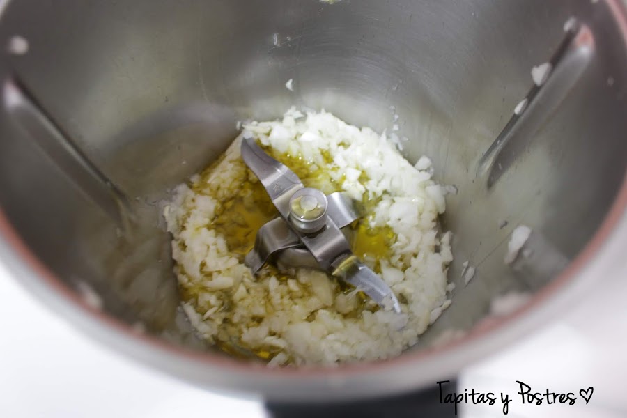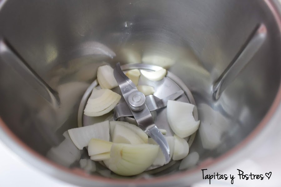 Poner los ajos y la cebolla en cuartos en el vaso de la thermomix y picar 3 segundos a velocidad 5. bajar los restos de las paredes del vaso hacia a bajo y añadir el aceite. Programar 7 minutos, varoma y velocidad 1.