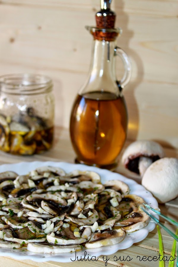 Si os gustan los encurtidos, los boquerones en vinagre...esta os gustará. Es un aperitivo muy rico y fresquito y como ahora podemos encontrar champiñones en los mercados todo el año no hay problema para hacerla.