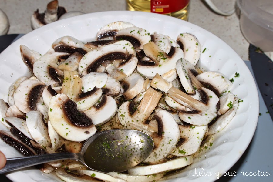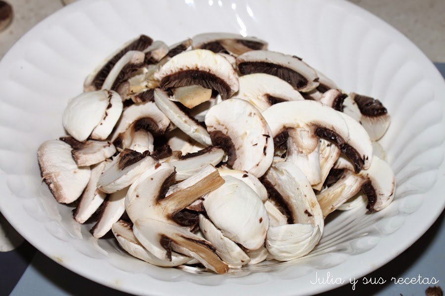 Limpiamos los champiñones y los partimos en láminas no demasiado finas.