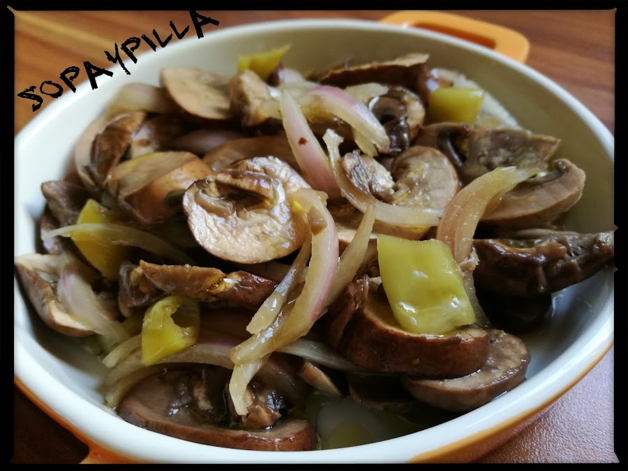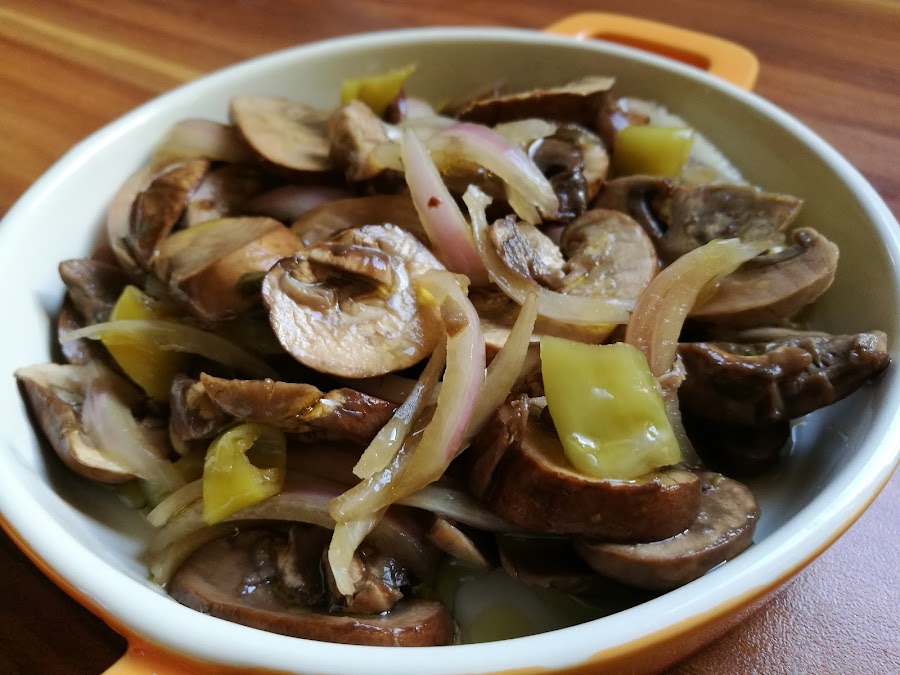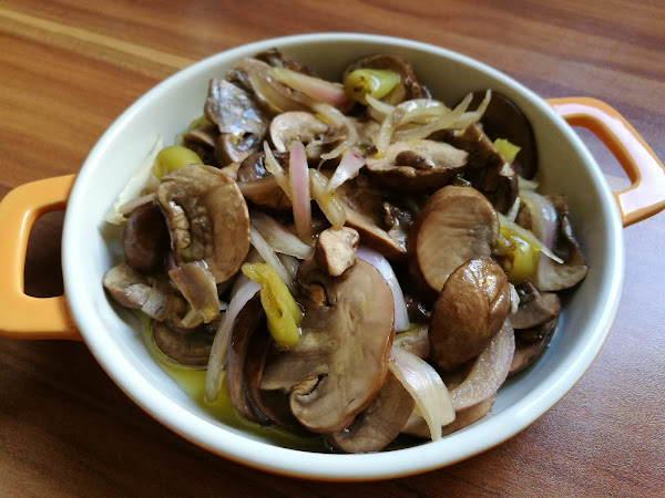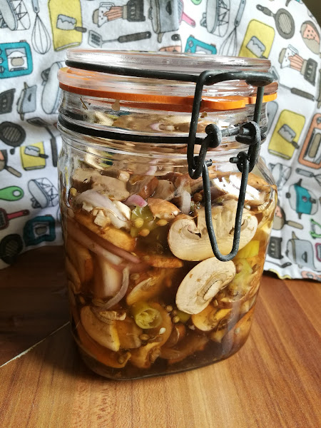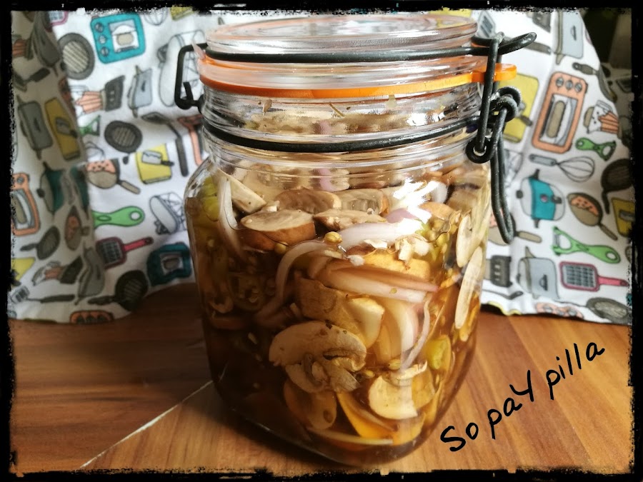 - Cortar los champiñones a rodajas gruesas y meter en un frasco con la cebolla y las guindillas laminadas finas y el tomillo.