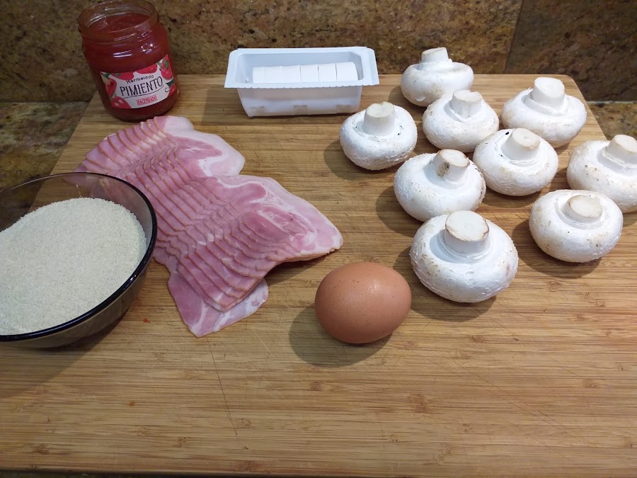 9 champiñones de tamaño grande, 9 lonchas de bacon ahumado, un poco de queso de cabra, 1 huevo, pan rallado y mermelada de pimientos rojos o de tomate