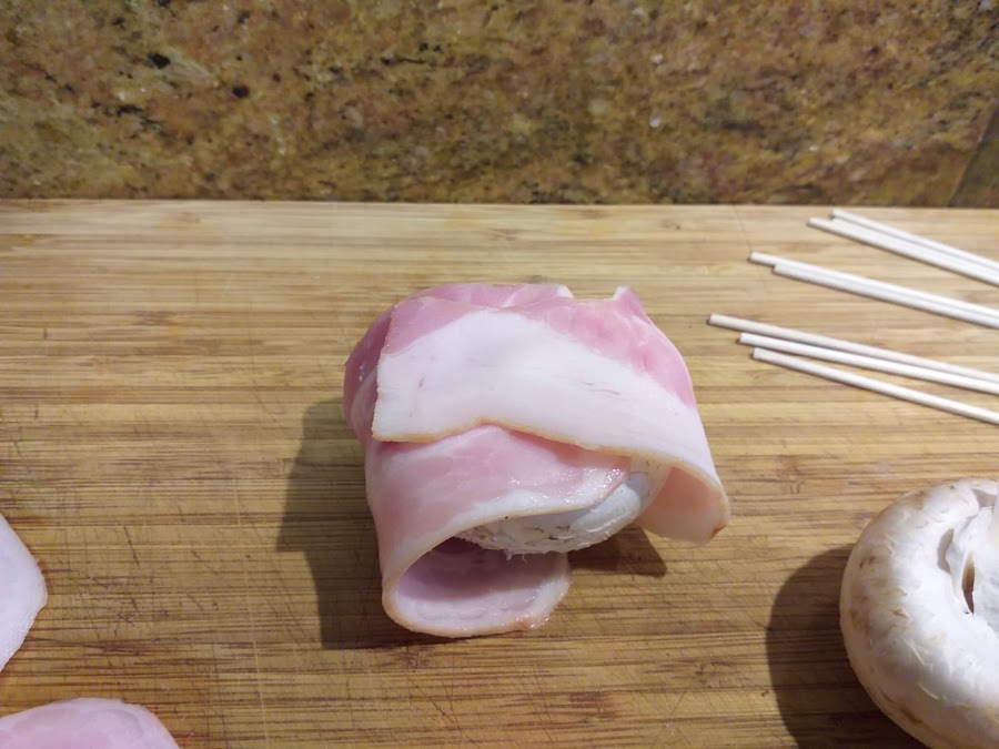 Envolvemos el champiñón con una loncha de bacon ahumado dejando el doblez en la parte de arriba
