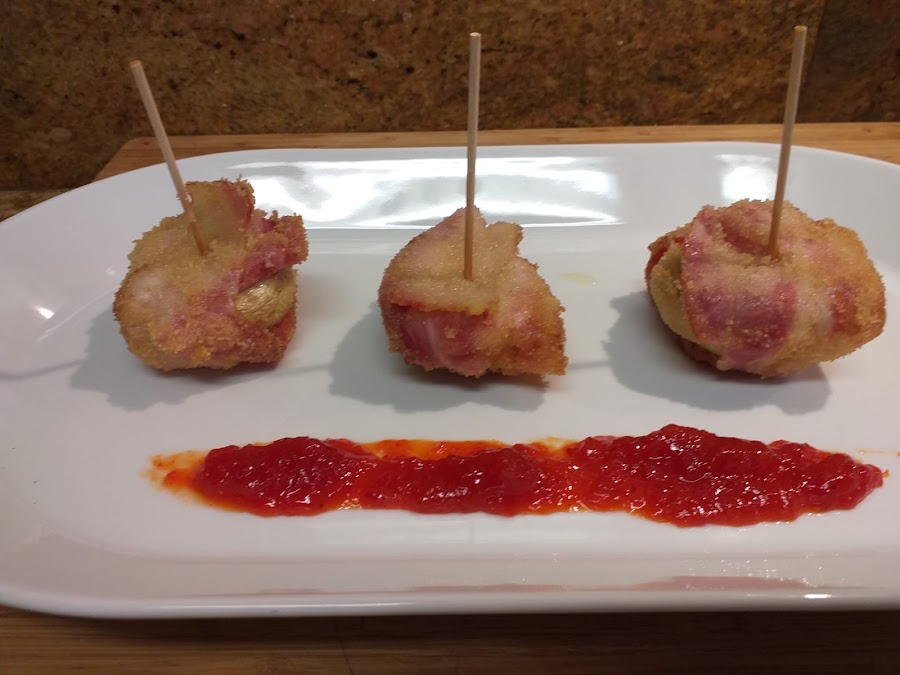 Hola holaa!!! Hoy os traigo una receta para entrantes o aperitivos. Se prepara en un momento y está deliciosa. No hay mucho más que explicar, un champiñón relleno de queso de cabra y en vuelto en bacon ahumado, para chuparse los dedos. Espero que os guste