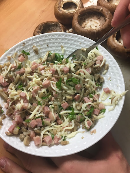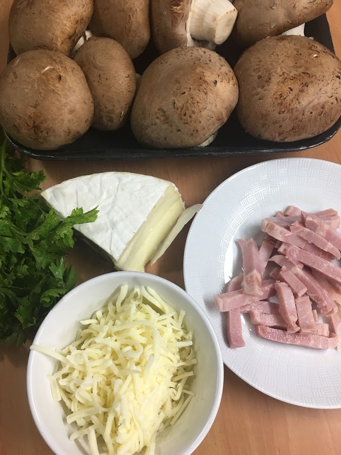 He contado dos champiñones por persona y me he decidido por lo que tenía en casa: bacon, queso mozzarella rallado y brie. Vosotros podéis optar también por otros rellenos, dependiendo de lo que tengáis en casa: jamón cocido o serrano, queso manchego, gambas...