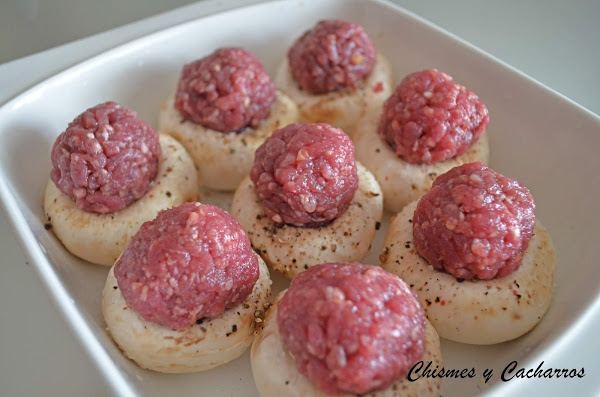 Sacar la carne picada del frigo, coger pequeñas porciones de masa y dar forma de albóndiga con un tamaño acorde con los champiñones. Colocar sobre ellos y reservar.