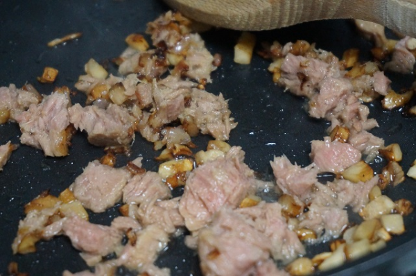 Cuando esté bien pochado añadimos el atún. Removemos y mezclamos todo. Apagamos.