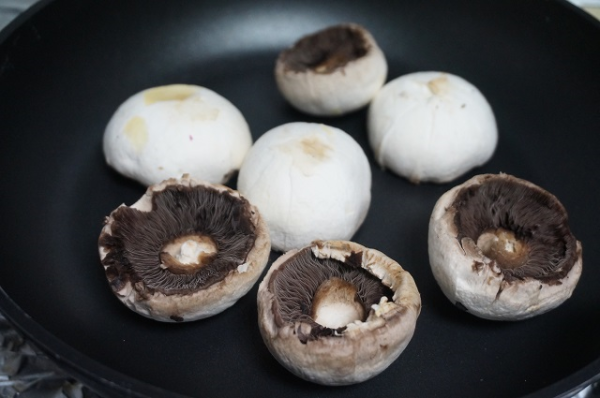 Ponemos una plancha o una sartén y doramos los champiñones.