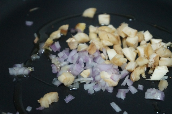 Picamos la cebolla y los tronquitos de los champiñones. En una sartén ponemos un chorro de aceite y lo doramos todo junto.
