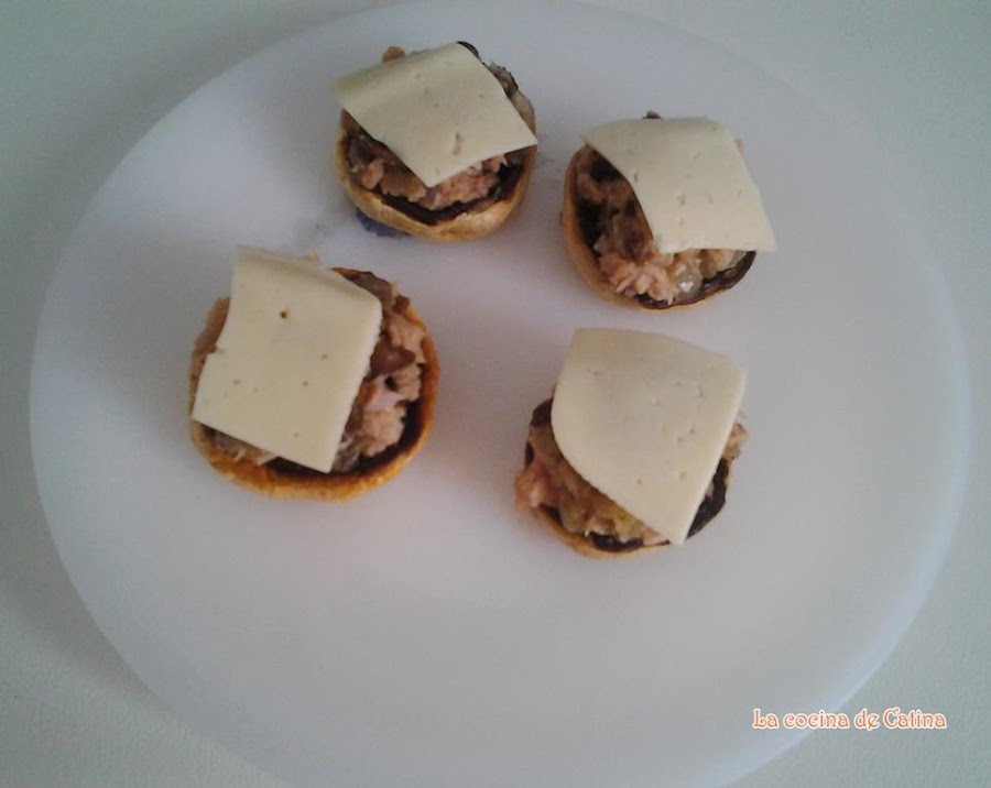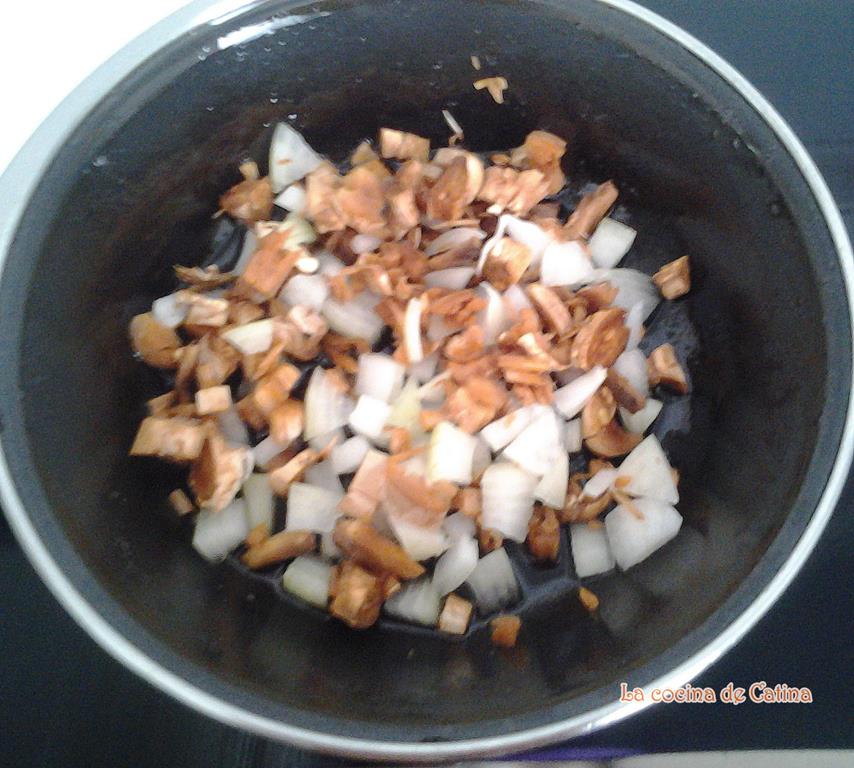Mientras se hacen, picamos la cebolla y los péndulos de los champiñones, y los freímos en una sartén con aceite. Una vez fritos se apartan del fuego y se le añade el atún desmigado.
