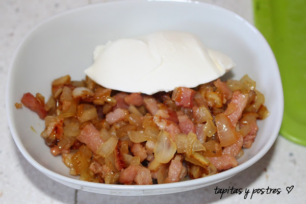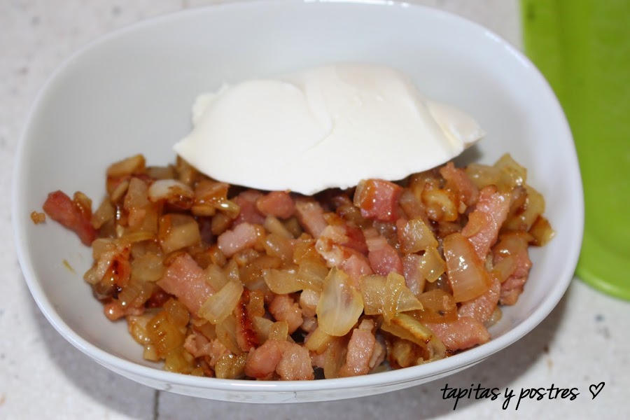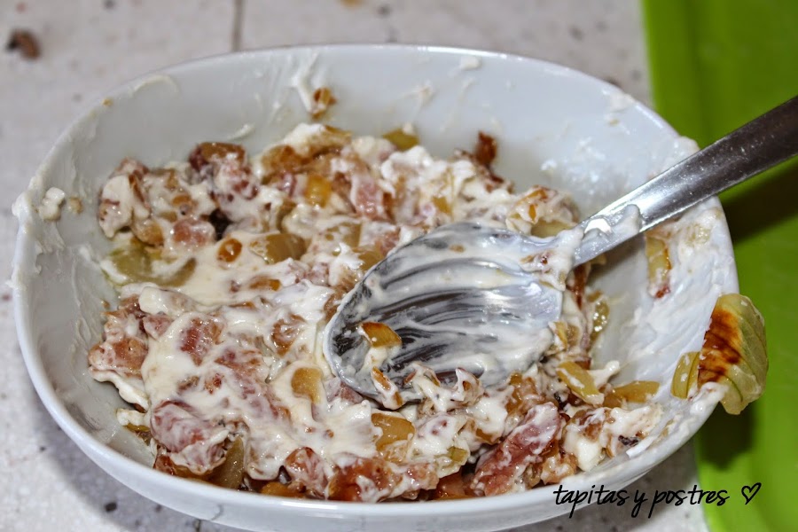 Sacamos la mezcla de cebolla, y bacon y añadimos el queso crema (tipo philadelphia). Mezclamos bien y rellenamos los champiñones .