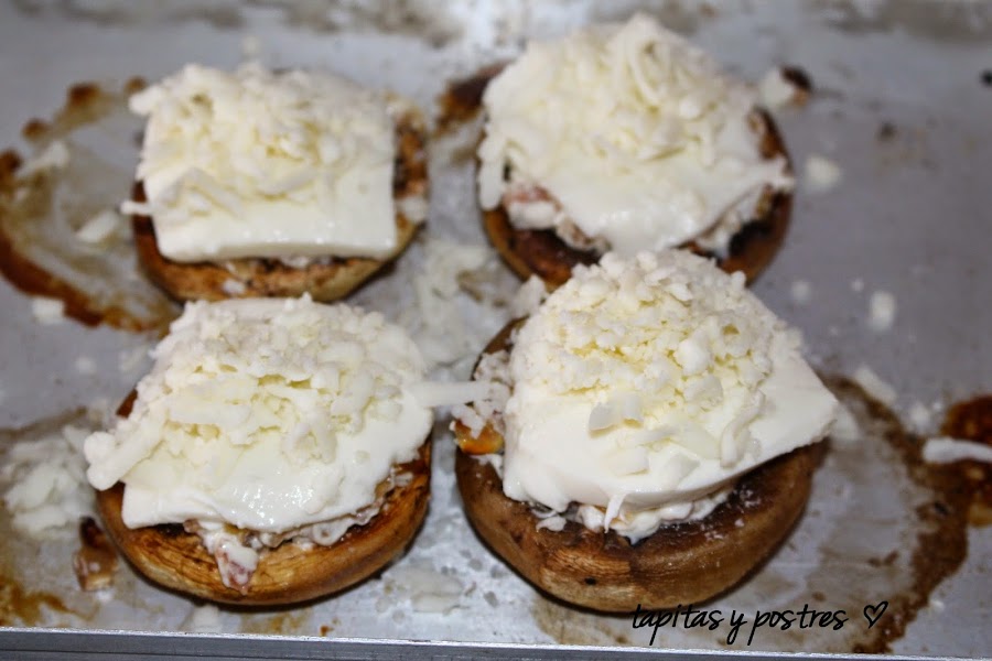 Damos la vuelta a los champiñones y rellenamos con la mezcla. Ponemos una rodaja de mozzarella encima.