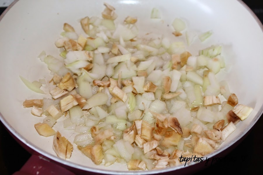 Mientras hacemos el relleno. Picamos la cebolla y el tallo de los champiñones y lo sofreímos en un poquito de aceite.