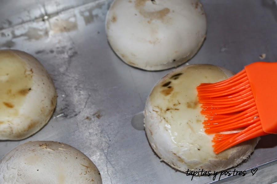 Le quitamos el tallo a los champiñones y reservamos un par de ellos. Limpiamos con un paño húmedo los champiñones sin mojarlos y los ponemos boca abajo en una fuente de horno. Los pincelamos con aceite de oliva y horneamos diez minutos.