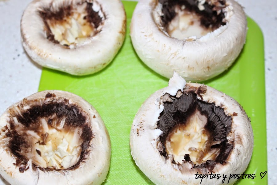 Limpiamos los champiñones con un paño húmedo y les quitamos el tallo. Reservamos un par de tallos y vaciamos un poquito el champiñón.