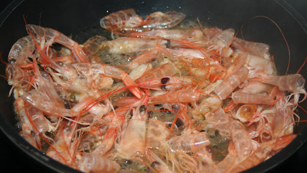 Las cabezas las sofrío en una sartén a fuego algo con un poco de aceite de oliva y unas gotas de agua. Extraigo el jugo de las cabezas aplastándolas y cuelo el líquido resultante sobre las gambas del bol a través de un colador.