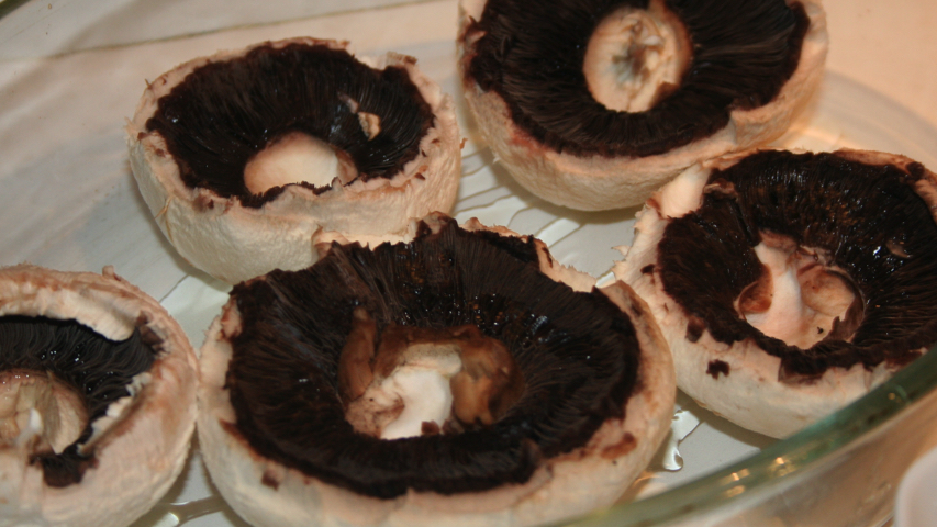 Pongo un chorrito de aceite de oliva en una fuente de horno y coloco en ella los sombreritos de los champiñones boca arriba.