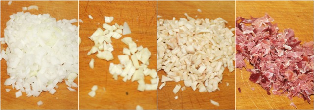 Partiremos así mismo el jamón en trocitos muy pequeños y lo añadimos también a la sartén.