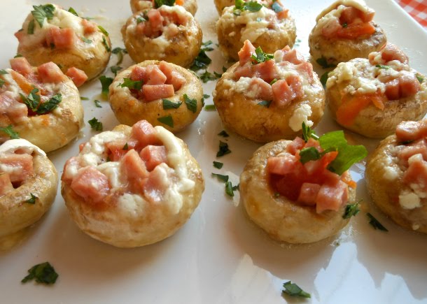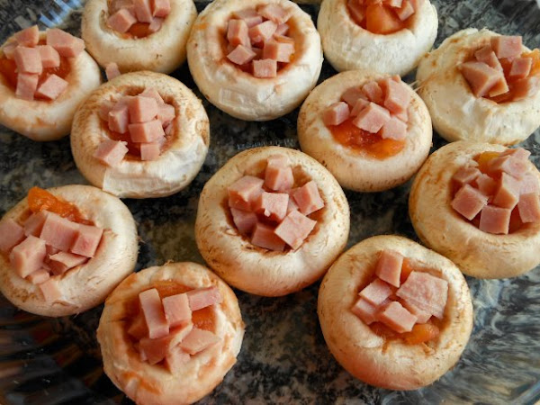 Después coloca los champiñones sobre la fuente apta para el microondas y rellénalos con los trocitos de tomate y los dados de jamón york.