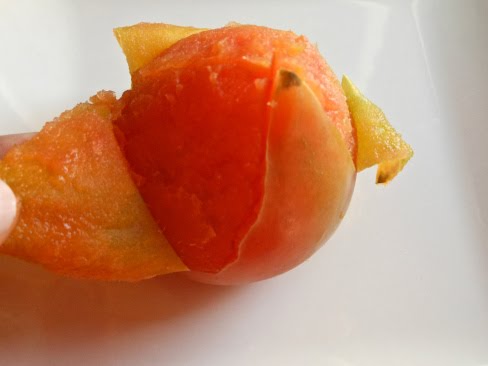 Transcurrido el tiempo saca el tomate del agua y déjalo enfriar un poco, después retira su piel.