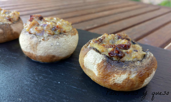 Secamos los tomates secos en papel de cocina y los picamos. Mezclamos el tomate con los pies de los champiñones y añadimos la mozzarella desmenuzada.