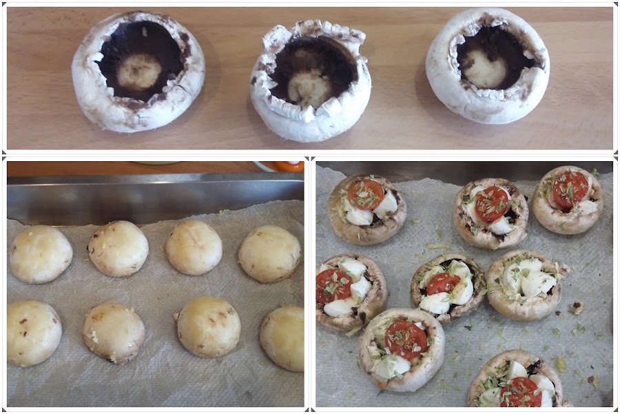 Les damos la vuelta y los rellenamos con trocitos de mozzarella , encima ponemos trocitos de tomate cherry , salamos, salpimentamos y por último añadimos un chorrito de aceite de oliva y el orégano. Abajo os pongo la foto de estos 3 pasos.