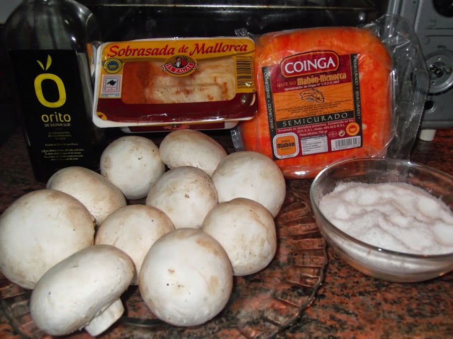 Les quitamos el rabo y los comenzamos a rellenar con un trocito de sobrasada y otro de queso, les añadimos un poquito de sal, aunque tampoco hace falta, ya que los otros dos productos son bastante sabrosos y un chorrito de aceite. El queso de Mahón es muy buena idea para este plato, ya que es cremoso y no tarda mucho en deshacerse y con la sobrasada hace una pareja perfecta, pero podéis cambiarlo perfectamente por otro tipo de queso que también se deshaga fácilmente en el horno como el brie o el queso de cabra.