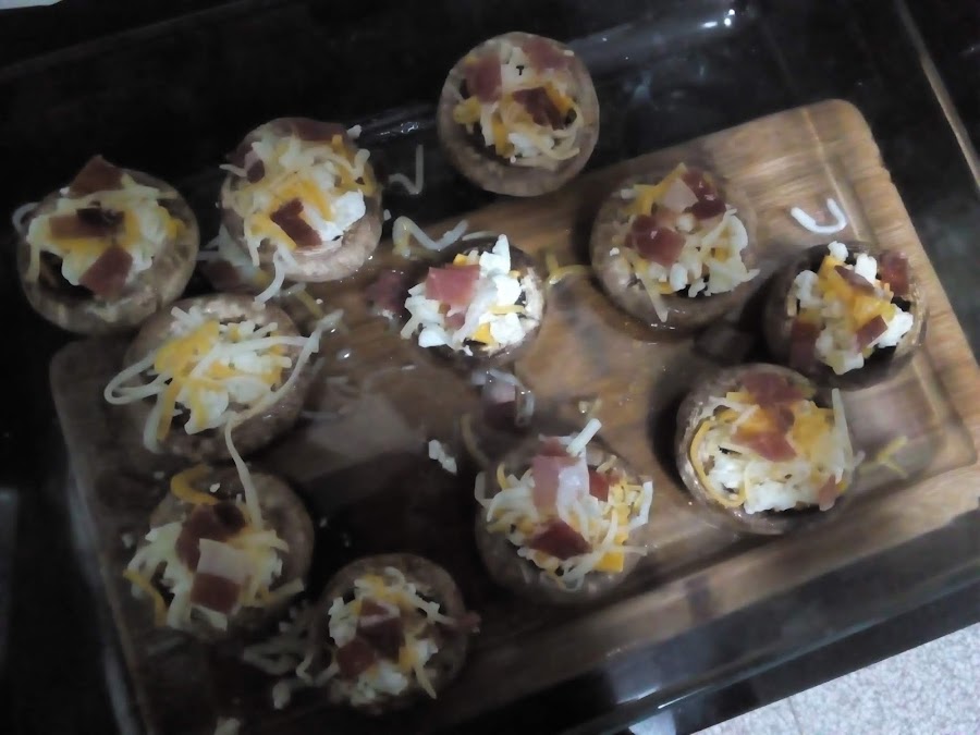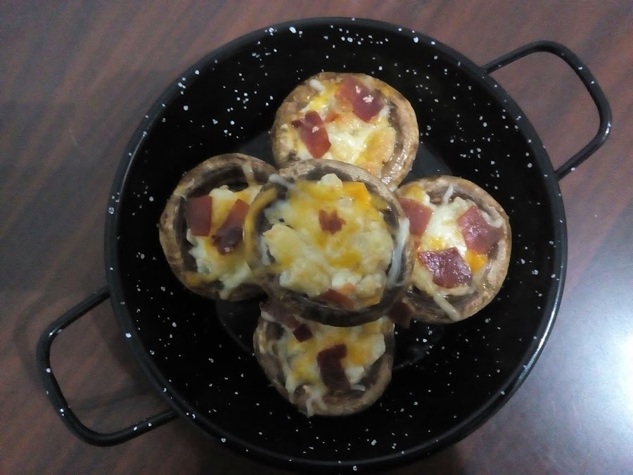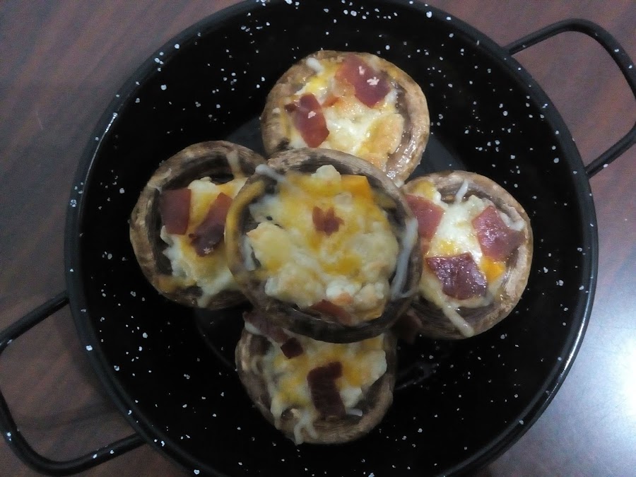 Sacamos los champiñones les añadimos la mezcla de quesos y un poco de jamón serrano por encima y lo metemos al horno durante cinco minutos o hasta que el queso esté fundido y ya está listo para comer.