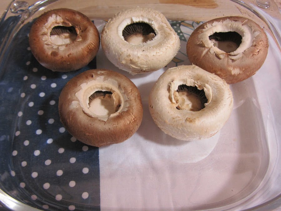 Limpiamos bien los champiñones para quitarles la tierra, y vaciamos los sombreritos. Reservamos los pies.