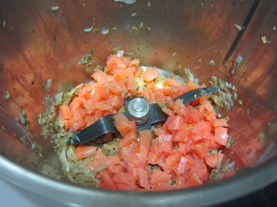 Sin Thermomix, agregamos a la sartén el salmón picado, y cocinamos durante unos minutos.