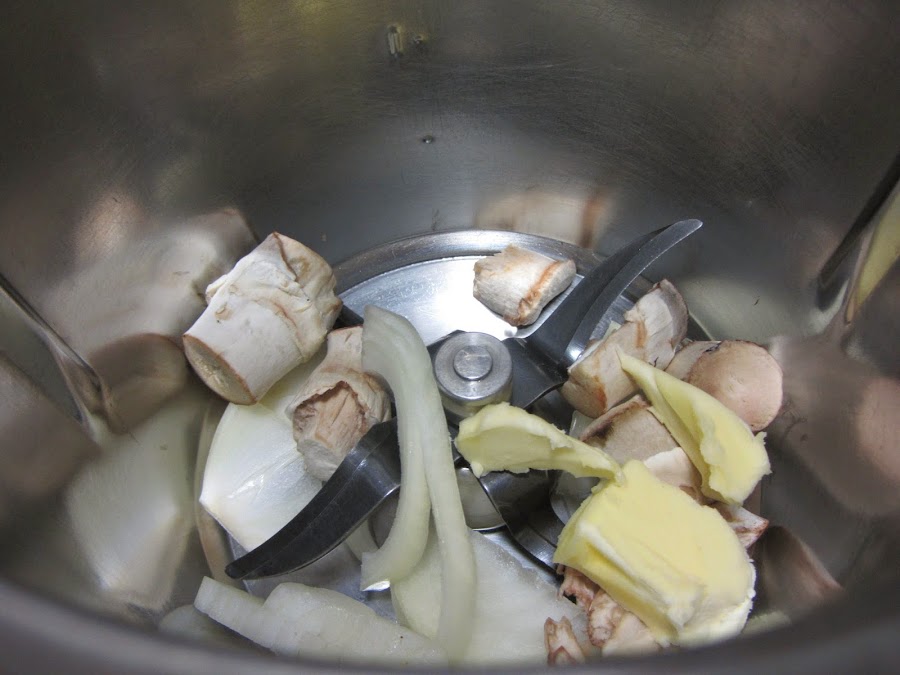 En el vaso de la Thermomix, colocamos los pies de los champiñones con la cebolla troceada, y 20 gramos de mantequilla. Programamos 6 segundos a velocidad 4, bajamos lo que pueda haber quedado en los bordes del vaso, y programamos 5 minutos, temperatura 100º, velocidad 2.