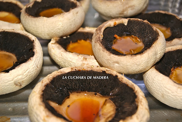 Sacados los champiñones del horno, le quitamos el agua que han soltado;como ven en la foto no están hechos del todo,sólo queremos quitarle esa agua amarga que sueltan.Reservamos.No apagamos el horno.
