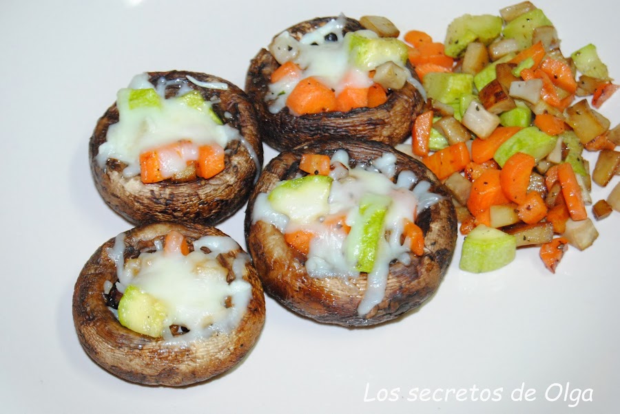 Hoy os presento unos champiñones rellenos de verduras de lo más sanitos. Sólo llevan un salteadito de verduras picaditas con muy poco aceite y queso mozzarella rallado. Yo le he puesto muy poquito queso, por eso de mantener la linea, pero consiste en echarle un buen puñadito en cada champiñón, esto le dará mucho más sabor. Recordad que los champiñones son más bien sositos, así que hay que salpimentarlos bastante para darle sabor.