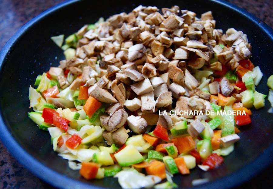 Lavamos el pimiento, el calabacino y la zanahoria; pelamos la cebolla y lo cortamos en trozos pequeños. En una sartén con aceite de oliva ponemos todos los ingredientes unos 15 minutos a fuego medio / bajo. Removemos cada cierto tiempo para que no se queme