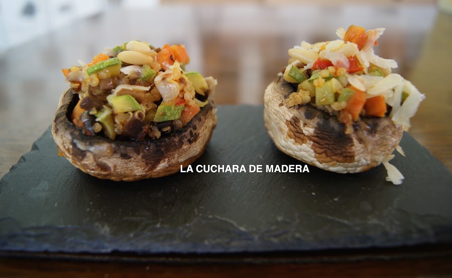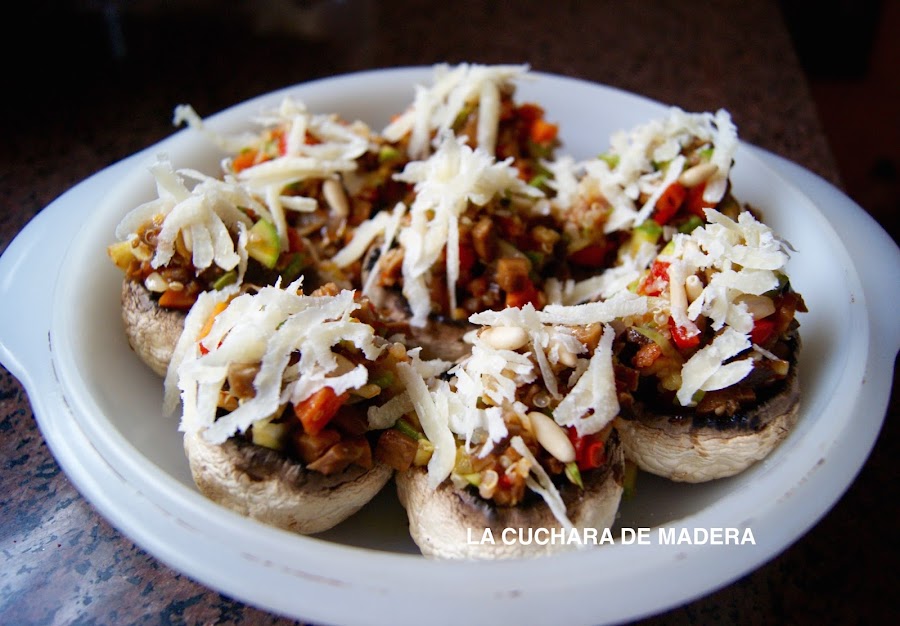 Encendemos el horno a fuego medio y metemos los champiñones unos 15 minutos con un hilo de aceite de oliva en la base de la fuente; van a soltar líquido que quitaremos de la fuente y los secamos por dentro