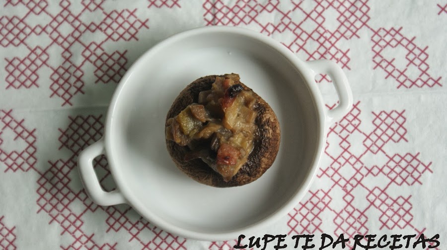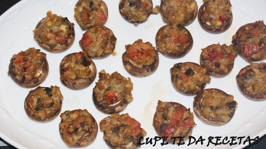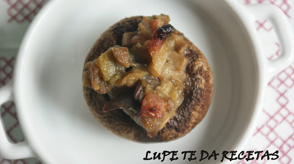 Lavar los champiñones, retirar el rabo a los champiñones y picar, reservar las cestas de los champiñones sin picar, picar también la cebolla, las zanahorias y el jamón. En una sartén sofreír la cebolla y las zanahorias hasta dorar, cuando empiece a tener color añadir los champiñones y unos minutos antes de retirar añadir el jamón, dejar un minuto y retirar.