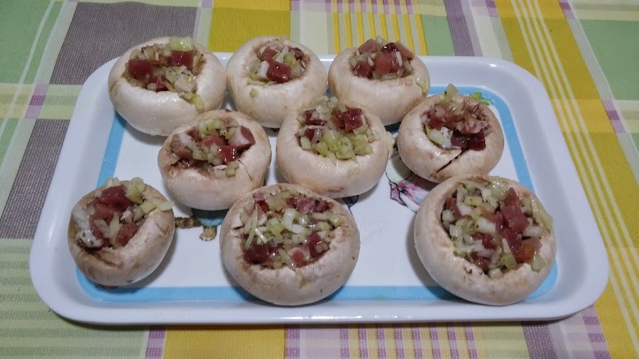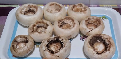 Paso 1: Limpiamos los champiñones y les quitamos el rabo. Hacemos un poco mas grande el hueco con la ayuda de un cuchillo. Y los vamos colocando sobre una bandeja. Salamos los champiñones y los reservamos.